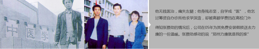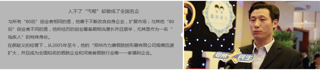 鄭州市力康假肢矯形器有限公司(簡稱力康),是一家專業(yè)從事假肢矯形器的設(shè)計(jì)、研發(fā)、制作及裝 配的專業(yè)機(jī)構(gòu)。成立于1992年是河南省唯一一家福利企業(yè)。力康下設(shè)業(yè)務(wù)部、技術(shù)部、住院部、康復(fù) 部、售后服務(wù)部,并配有現(xiàn)代化的裝配車間和功能齊全的訓(xùn)練大廳,為殘疾朋友康復(fù)訓(xùn)練提供了可靠 保障??偨?jīng)理穿戴假肢多年,有著豐富的臨床經(jīng)驗(yàn)和親身體會;多年來,力康已為全國幾十萬名殘疾 朋友安裝上舒適、美觀、耐用的假肢和矯形器具,使他們更大限度地恢復(fù)了正常的工作和生活。“產(chǎn) 品即人品”的質(zhì)量理念、先進(jìn)的技術(shù)、實(shí)惠的價(jià)格、完善的售后服務(wù)是力康取勝的法寶……